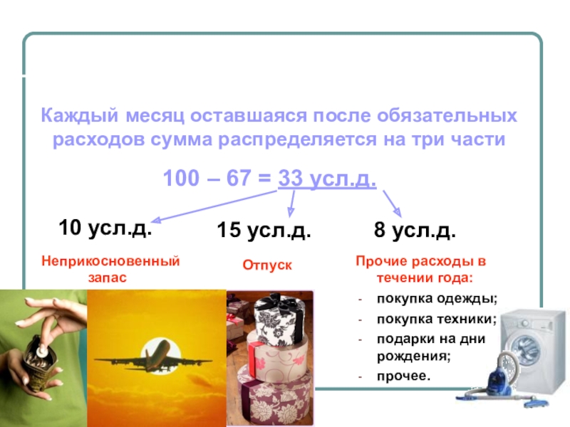 Каждый месяц оставшаяся после обязательных расходов сумма распределяется на три части