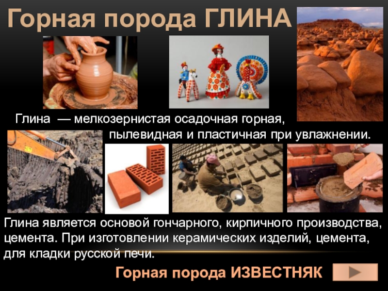 Глина является основой гончарного, кирпичного производства, цемента. При изготовлении керамических изделий, цемента, для кладки русской печи.
