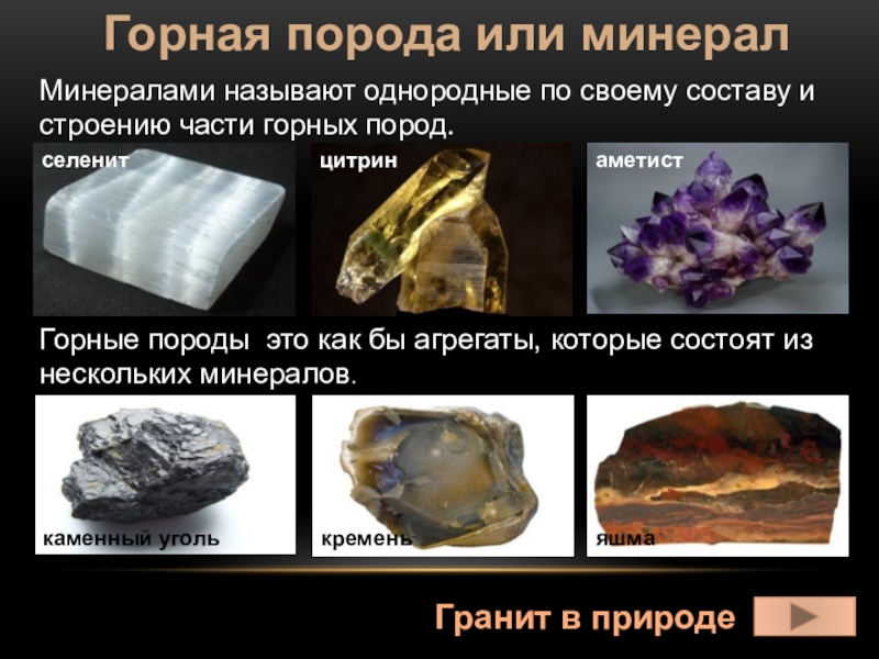 Горные породы это как бы агрегаты, которые состоят из нескольких минералов.