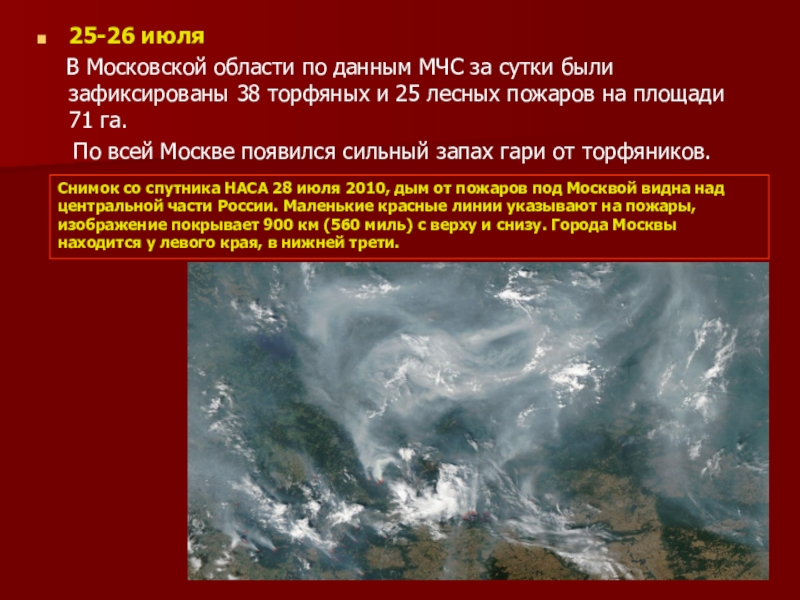 Снимок со спутника НАСА 28 июля 2010, дым от пожаров под Москвой видна над центральной части России. Маленькие красные линии указывают на пожары, изображение покрывает 900 км (560 миль) с верху и снизу. Города Москвы находится у левого края, в нижней трети.