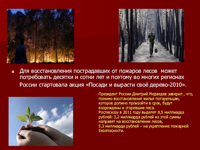 Слайд 21Для восстановления пострадавших от пожаров лесов может потребовать десятки и сотни
