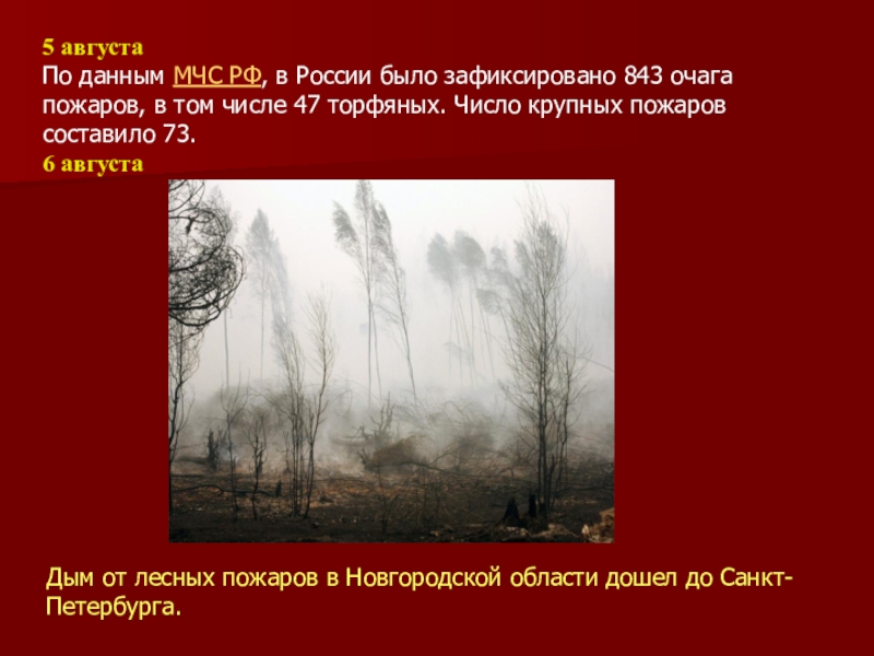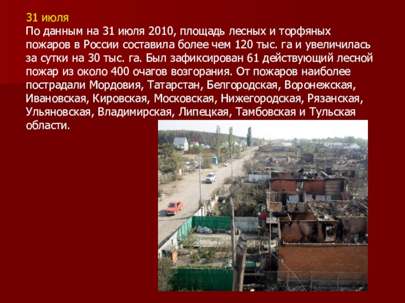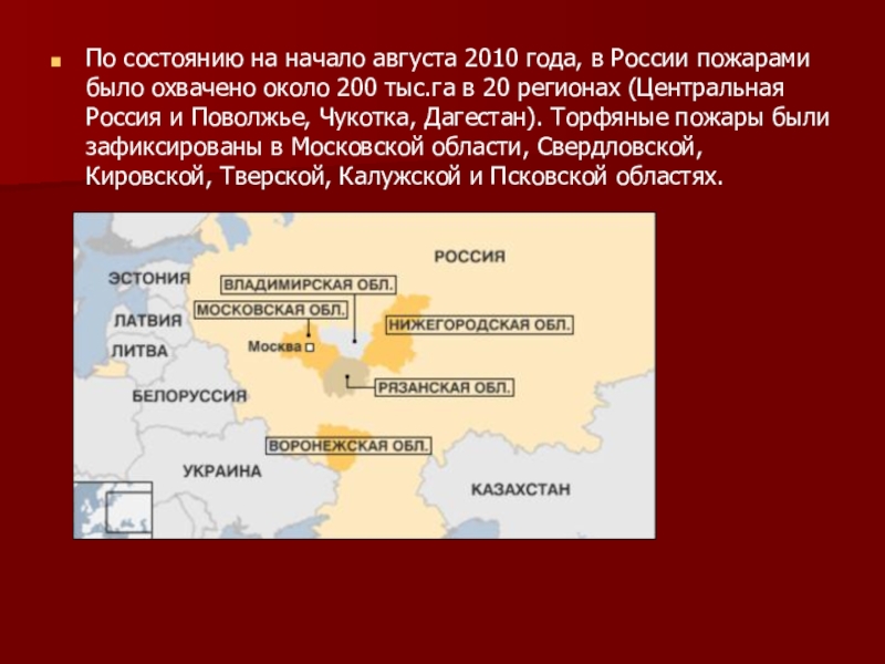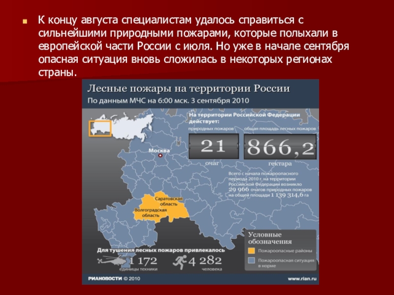 Слайд 3По состоянию на начало августа 2010 года, в России пожарами было
