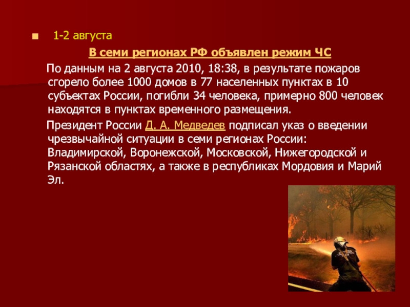 Президент России Д. А. Медведев подписал указ о введении чрезвычайной ситуации в семи регионах России: Владимирской, Воронежской, Московской, Нижегородской и Рязанской областях, а также в республиках Мордовия и Марий Эл.