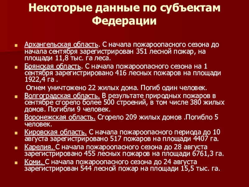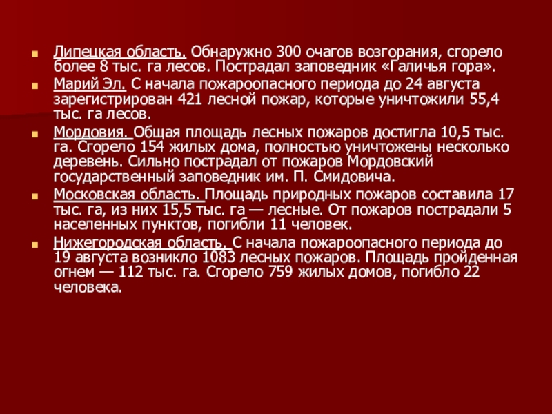 Мордовия. Общая площадь лесных пожаров достигла 10,5 тыс. га. Сгорело 154 жилых дома, полностью уничтожены несколько деревень. Сильно пострадал от пожаров Мордовский государственный заповедник им. П. Смидовича.