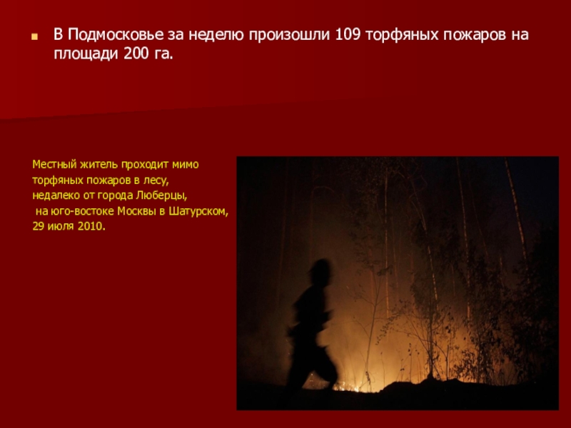 Слайд 5В Подмосковье за неделю произошли 109 торфяных пожаров на площади 200
