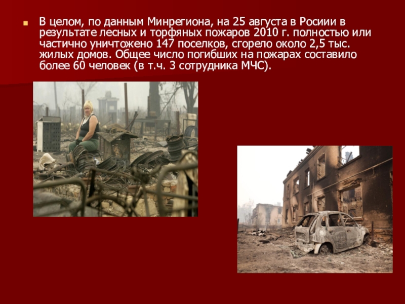 результате лесных и торфяных пожаров 2010 г. полностью или частично уничтожено 147 поселков, сгорело около 2,5 тыс. жилых домов. Общее число погибших на пожарах составило более 60 человек (в т.ч. 3 сотрудника МЧС).