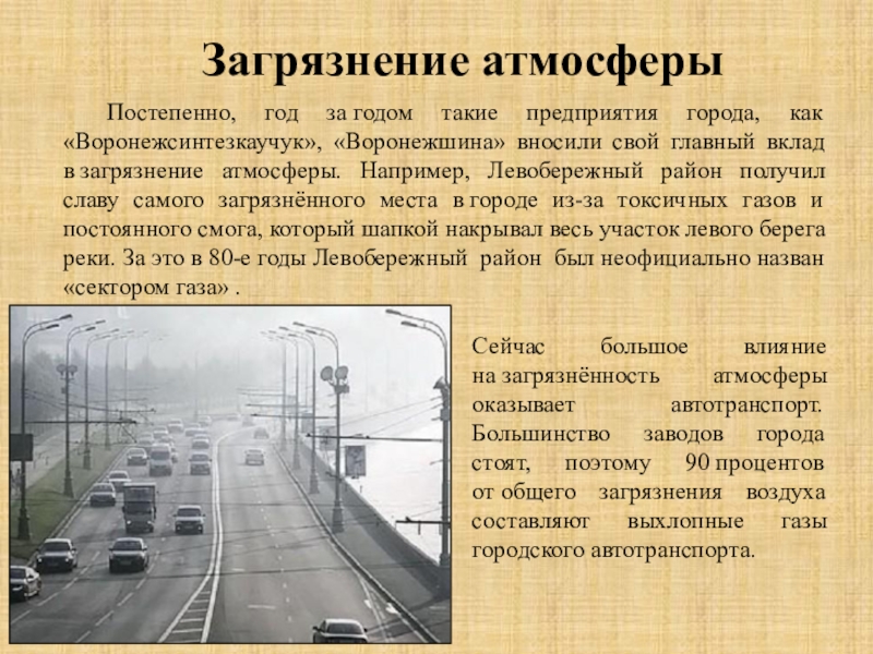 Сейчас большое влияние на загрязнённость атмосферы оказывает автотранспорт. Большинство заводов города стоят, поэтому 90 процентов от общего загрязнения воздуха составляют выхлопные газы городского автотранспорта.