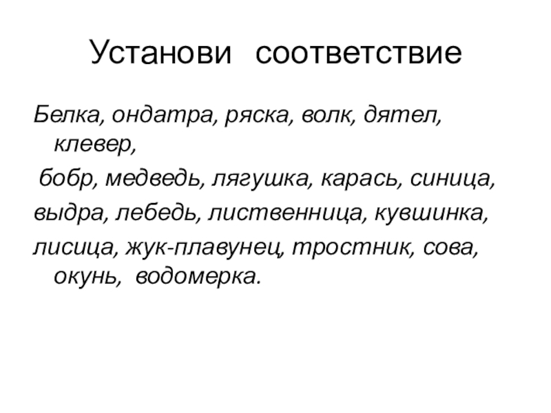 Белка, ондатра, ряска, волк, дятел, клевер,