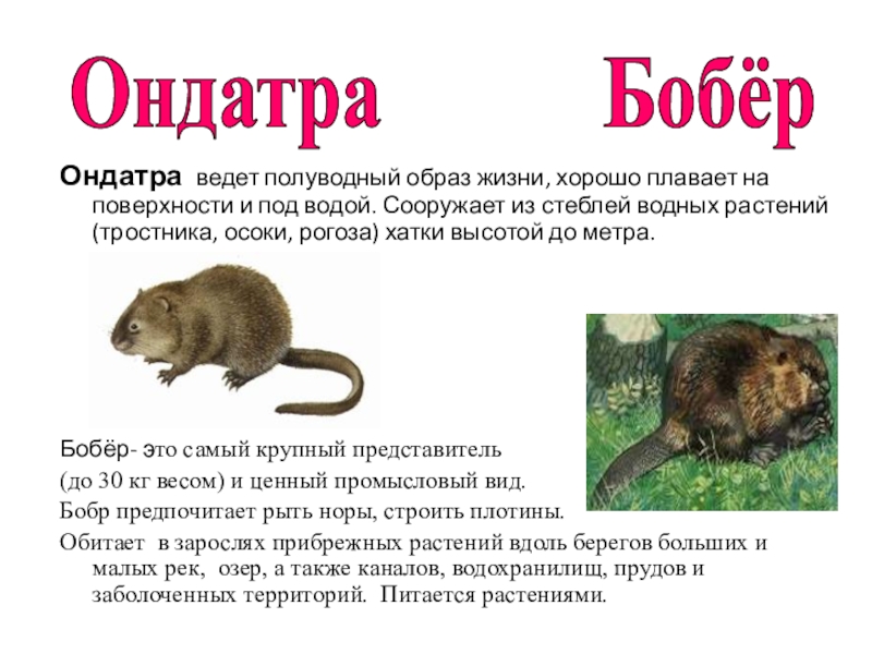 Слайд 16Ондатра ведет полуводный образ жизни, хорошо плавает на поверхности и под