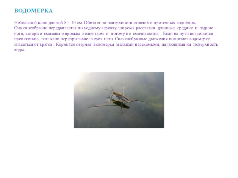 Небольшой клоп длиной 8 – 10 см. Обитает на поверхности стоячих