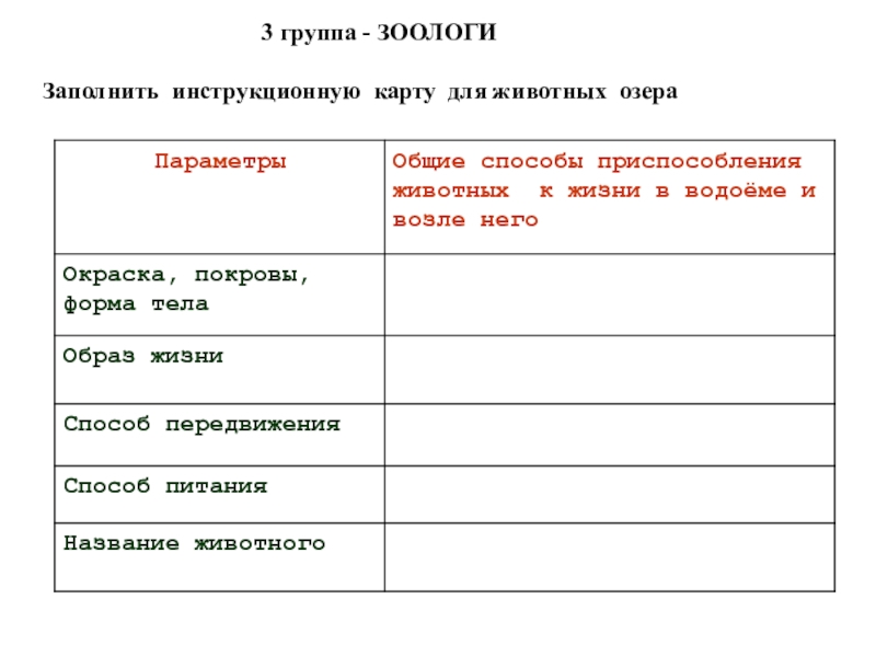 Заполнить инструкционную карту для животных озера