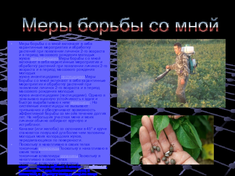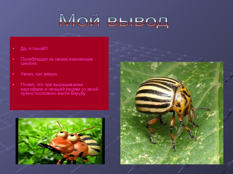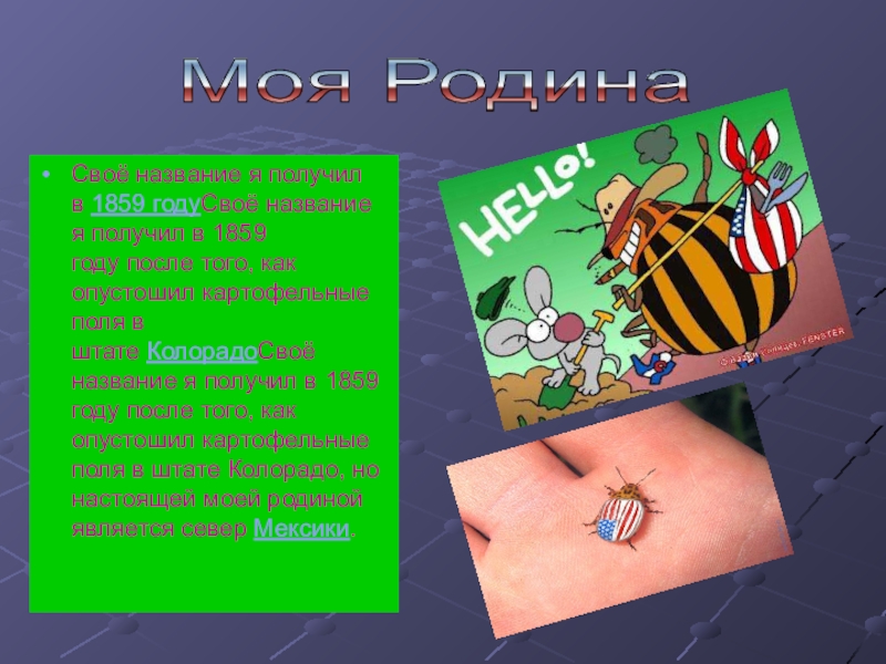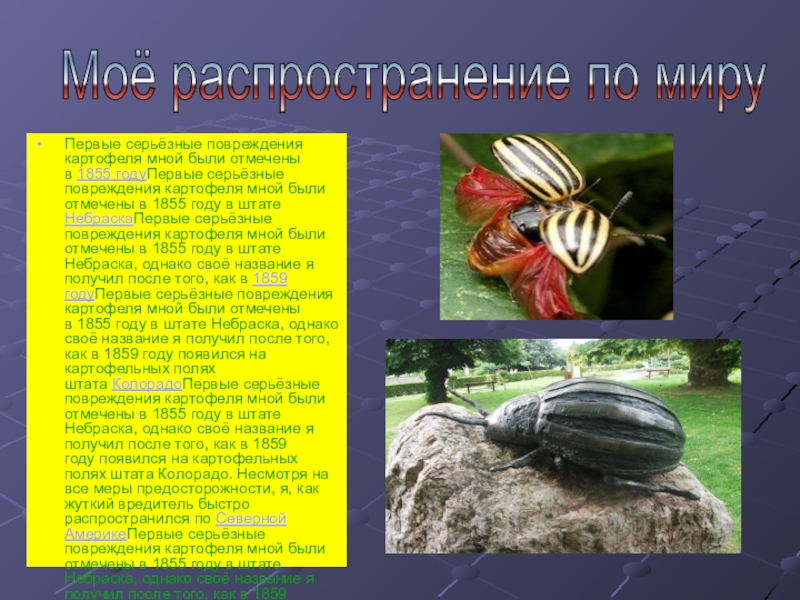 картофеля мной были отмечены в 1855 году в штате НебраскаПервые серьёзные повреждения картофеля мной были отмечены в 1855 году в штате Небраска, однако своё название я получил после того, как в 1859 годуПервые серьёзные повреждения картофеля мной были отмечены в 1855 году в штате Небраска, однако своё название я получил после того, как в 1859 году появился на картофельных полях штата КолорадоПервые серьёзные повреждения картофеля мной были отмечены в 1855 году в штате Небраска, однако своё название я получил после того, как в 1859 году появился на картофельных полях штата Колорадо. Несмотря на все меры предосторожности, я, как жуткий вредитель быстро распространился по Северной АмерикеПервые серьёзные повреждения картофеля мной были отмечены в 1855 году в штате Небраска, однако своё название я получил после того, как в 1859 году появился на картофельных полях штата Колорадо. Несмотря на все меры предосторожности, я, как жуткий вредитель быстро распространился по Северной Америке, а в 1876Первые серьёзные повреждения картофеля мной были отмечены в 1855 году в штате Небраска, однако своё название я получил после того, как в 1859 году появился на картофельных полях штата Колорадо. Несмотря на все меры предосторожности, я, как жуткий вредитель быстро распространился по Северной Америке, а в 1876 —1877 годахПервые серьёзные повреждения картофеля мной были отмечены в 1855 году в штате Небраска, однако своё название я получил после того, как в 1859 году появился на картофельных полях штата Колорадо. Несмотря на все меры предосторожности, я, как жуткий вредитель быстро распространился по Северной Америке, а в 1876 —1877 годах с грузами на пароходах пересёк Атлантический океан и впервые появился в Европе.