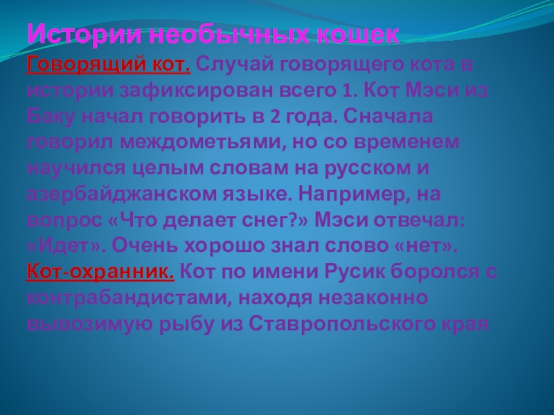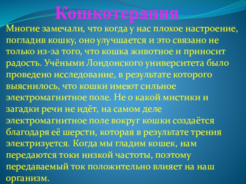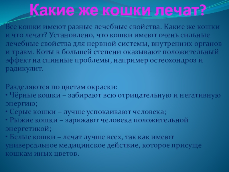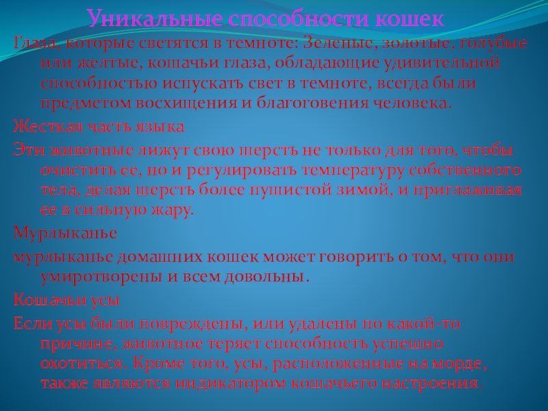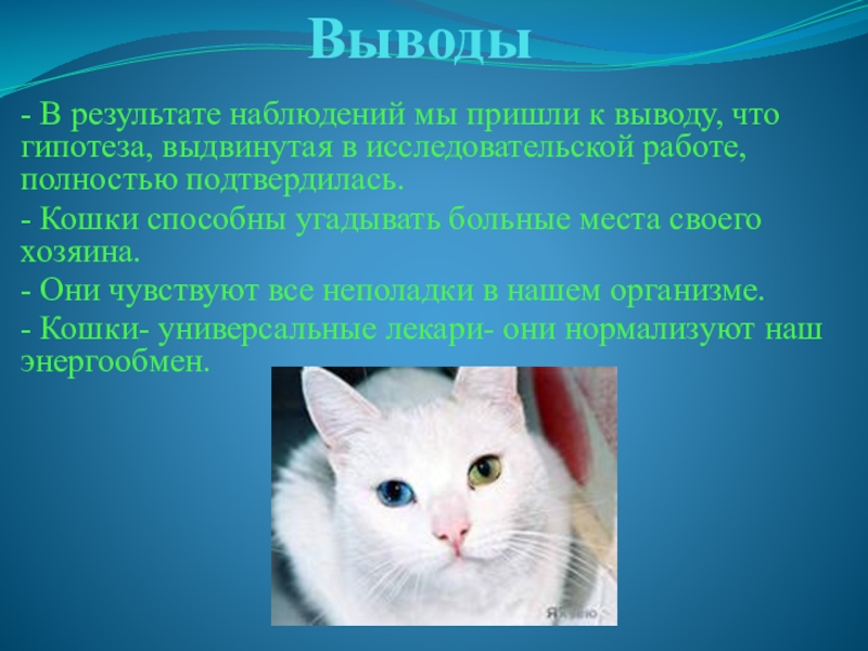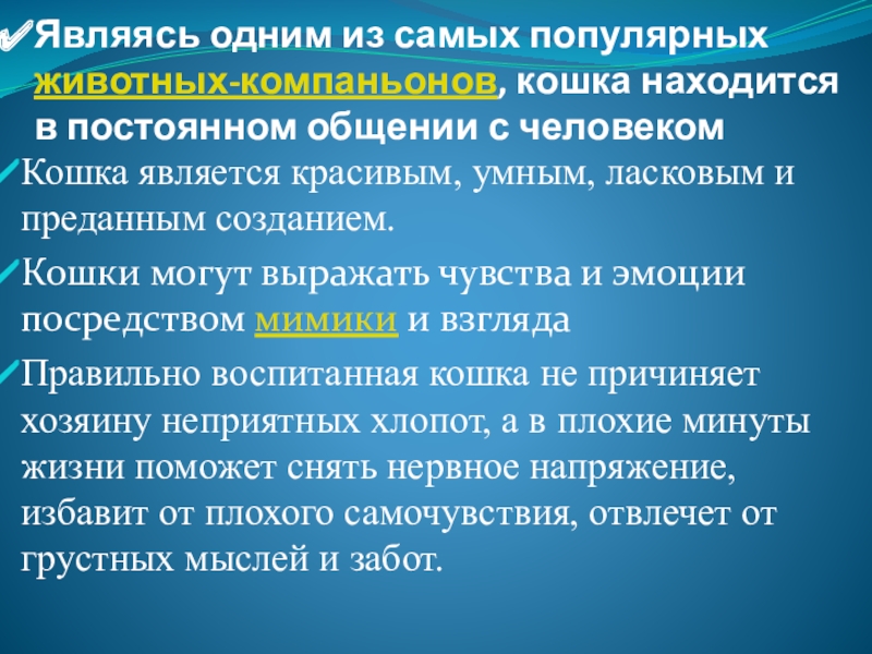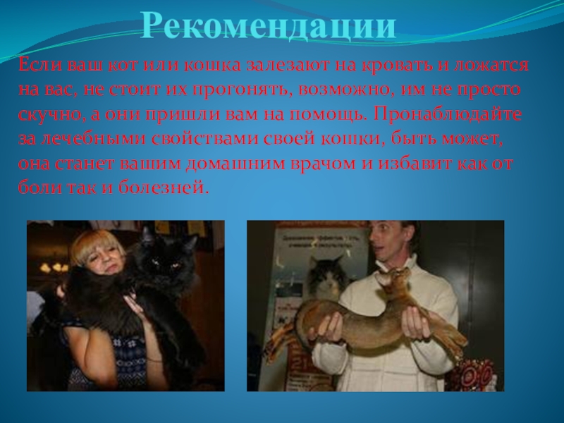 Правильно воспитанная кошка не причиняет хозяину неприятных хлопот, а в плохие минуты жизни поможет снять нервное напряжение, избавит от плохого самочувствия, отвлечет от грустных мыслей и забот.