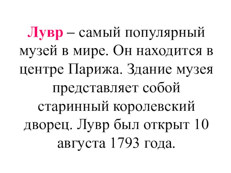 Лувр – самый популярный музей в мире. Он находится в центре Парижа. Здание музея представляет собой старинный королевский
