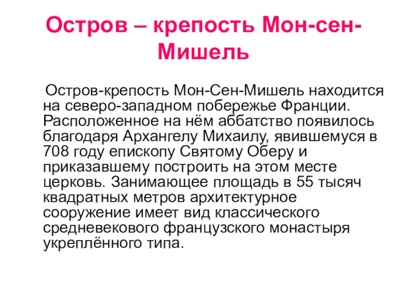 Остров – крепость Мон-сен-Мишель  Остров-крепость Мон-Сен-Мишель находится на северо-западном побережье Франции. Расположенное на нём аббатство появилось