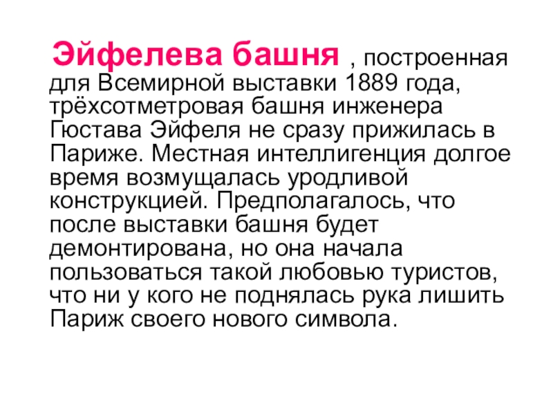 трёхсотметровая башня инженера Гюстава Эйфеля не сразу прижилась в Париже. Местная интеллигенция долгое время возмущалась уродливой конструкцией. Предполагалось, что после выставки башня будет демонтирована, но она начала пользоваться такой любовью туристов, что ни у кого не поднялась рука лишить Париж своего нового символа.