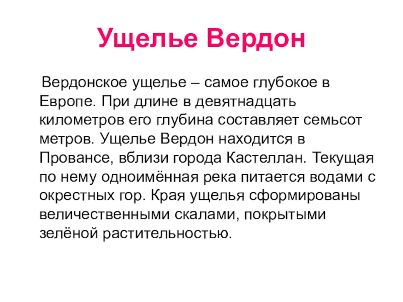 Ущелье Вердон  Вердонское ущелье – самое глубокое в Европе. При длине в девятнадцать километров его глубина