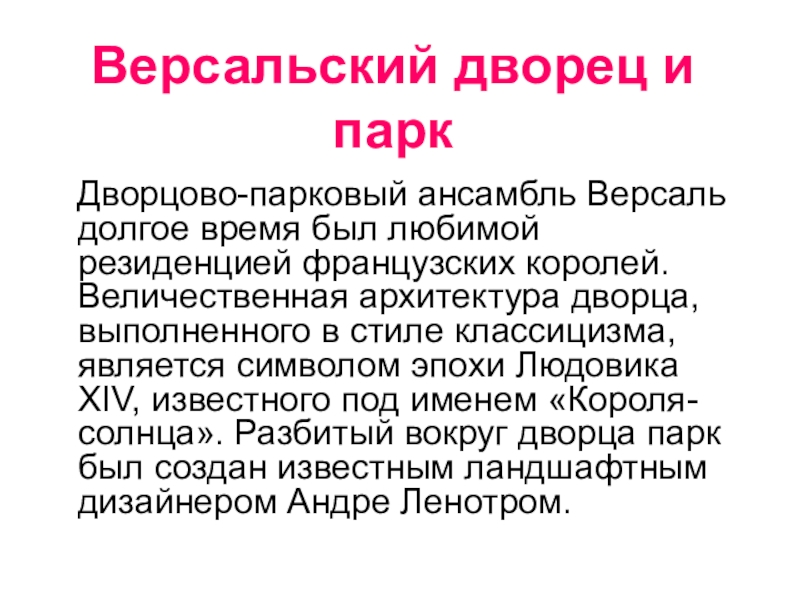 Версаль долгое время был любимой резиденцией французских королей. Величественная архитектура дворца, выполненного в стиле классицизма, является символом эпохи Людовика XIV, известного под именем «Короля-солнца». Разбитый вокруг дворца парк был создан известным ландшафтным дизайнером Андре Ленотром.