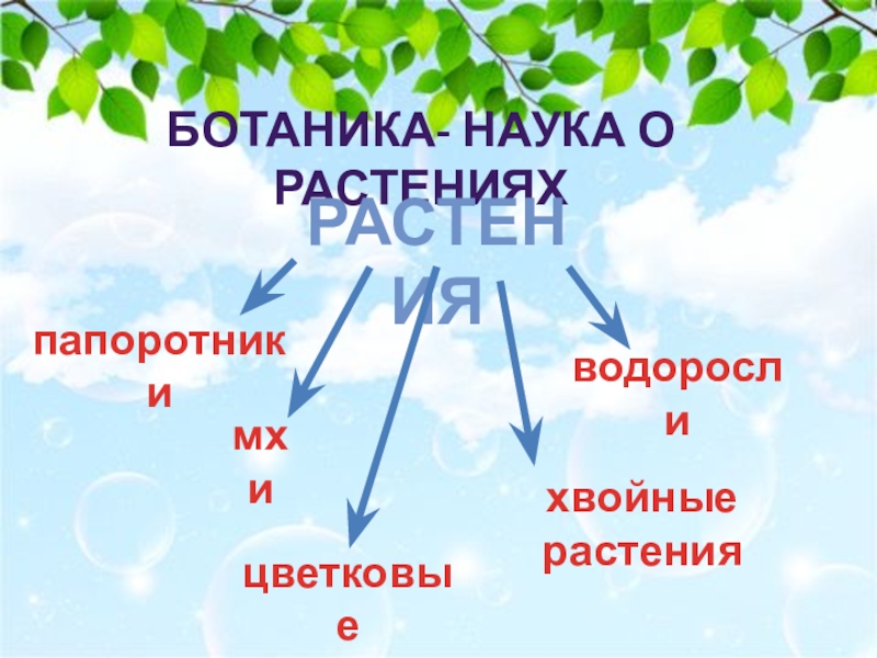 Ботаника- наука о растенияхрастенияпапоротникиводорослимхихвойные растенияцветковые