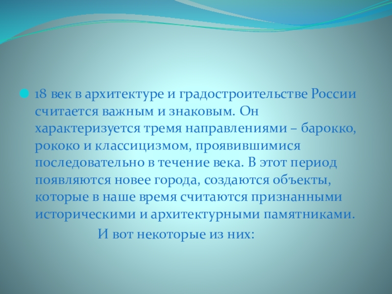 Слайд 518 век в архитектуре и градостроительстве России считается важным и знаковым.