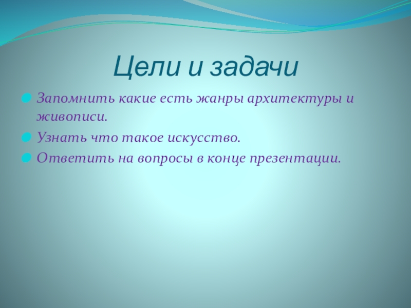 Цели и задачиЗапомнить какие есть жанры архитектуры и живописи.Узнать что такое искусство.Ответить на вопросы в конце презентации.
