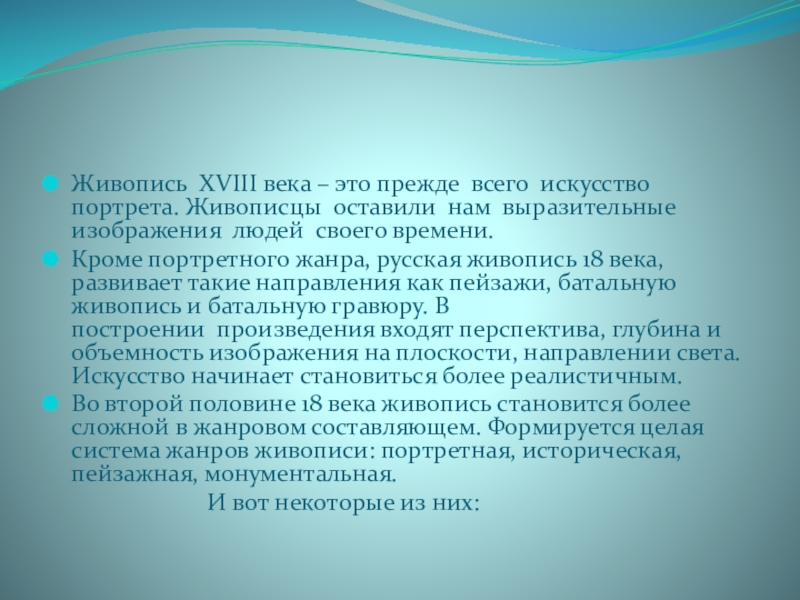 Живопись XVIII века – это прежде всего искусство портрета. Живописцы оставили нам выразительные изображения людей своего времени.Кроме