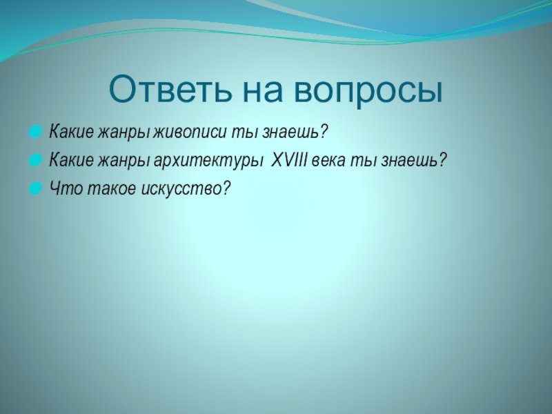 Ответь на вопросыКакие жанры живописи ты знаешь?Какие жанры архитектуры XVIII века ты знаешь?Что такое искусство?