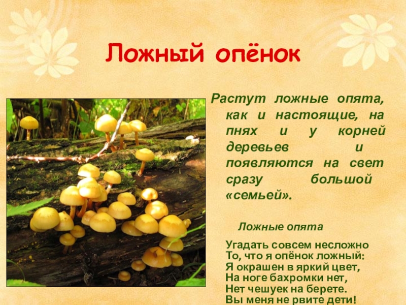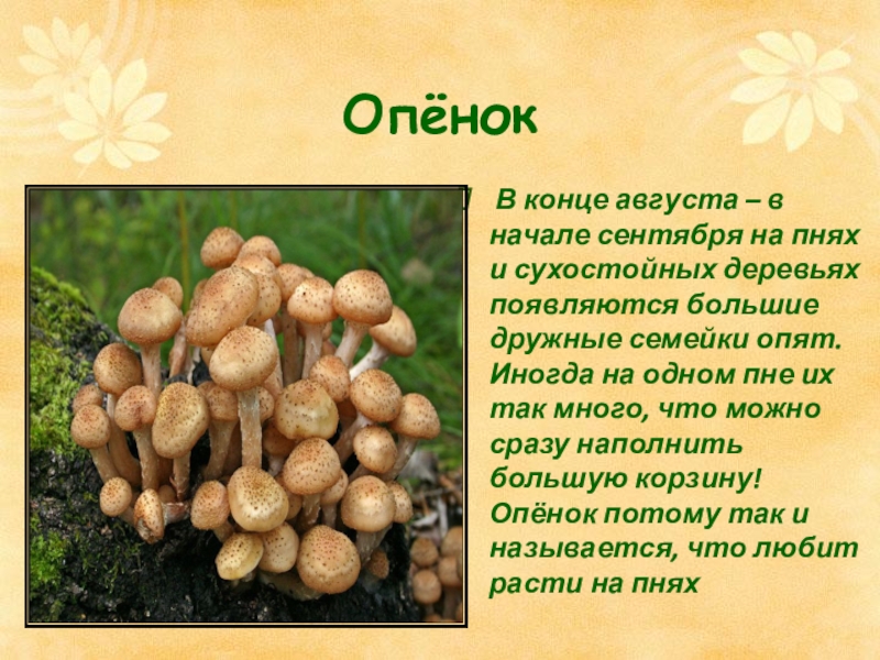 сухостойных деревьях появляются большие дружные семейки опят. Иногда на одном пне их так много, что можно сразу наполнить большую корзину! Опёнок потому так и называется, что любит расти на пнях