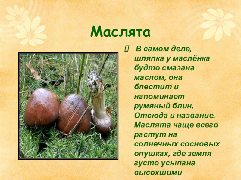 блестит и напоминает румяный блин. Отсюда и название. Маслята чаще всего растут на солнечных сосновых опушках, где земля густо усыпана высохшими сосновыми иголками.