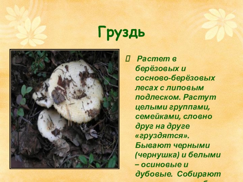 целыми группами, семейками, словно друг на друге «груздятся». Бывают черными (чернушка) и белыми – осиновые и дубовые. Собирают с июля по сентябрь.