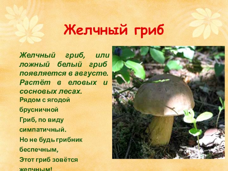 Желчный гриб, или ложный белый гриб появляется в августе.