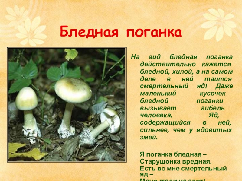 самом деле в ней таится смертельный яд! Даже маленький кусочек бледной поганки вызывает гибель человека. Яд, содержащийся в ней, сильнее, чем у ядовитых змей.