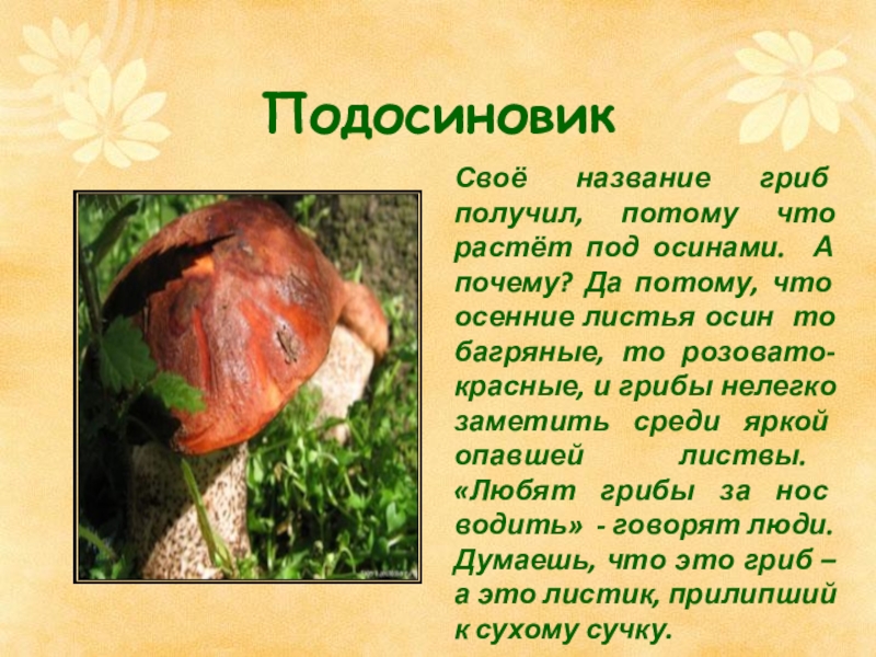 почему? Да потому, что осенние листья осин то багряные, то розовато-красные, и грибы нелегко заметить среди яркой опавшей листвы. «Любят грибы за нос водить» - говорят люди. Думаешь, что это гриб – а это листик, прилипший к сухому сучку.