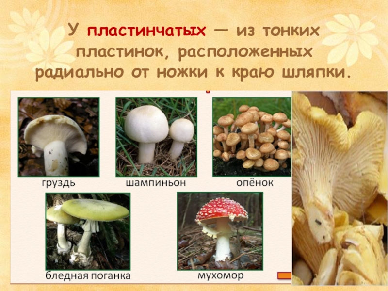 Слайд 5У пластинчатых — из тонких пластинок, расположенных радиально от ножки к