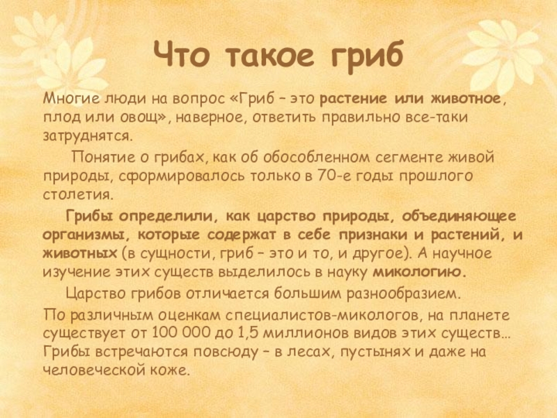 Грибы определили, как царство природы, объединяющее организмы, которые содержат в себе признаки и растений, и животных (в сущности, гриб – это и то, и другое). А научное изучение этих существ выделилось в науку микологию.
