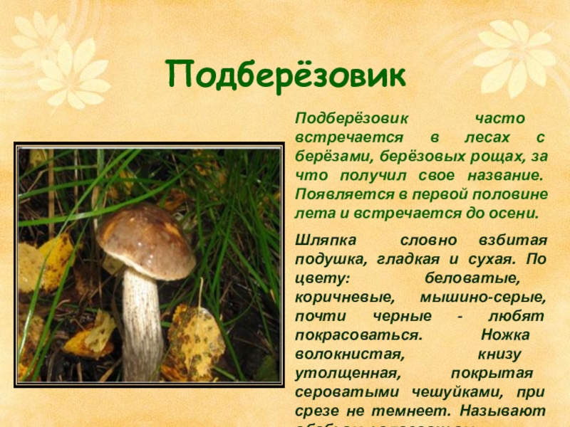 Шляпка словно взбитая подушка, гладкая и сухая. По цвету: беловатые, коричневые, мышино-серые, почти черные - любят покрасоваться. Ножка волокнистая, книзу утолщенная, покрытая сероватыми чешуйками, при срезе не темнеет. Называют обабком, колосовиком.
