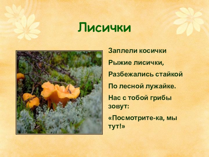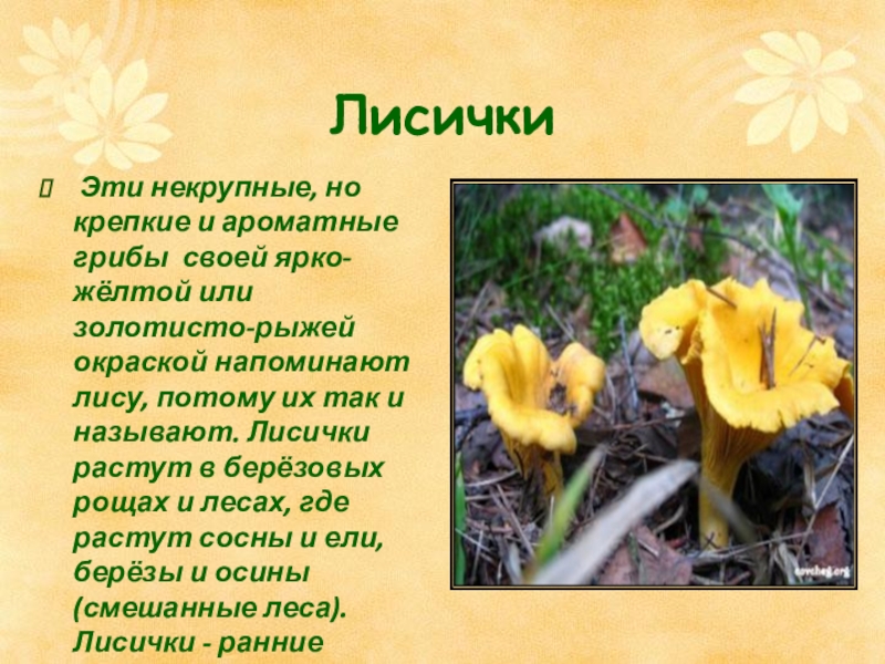 золотисто-рыжей окраской напоминают лису, потому их так и называют. Лисички растут в берёзовых рощах и лесах, где растут сосны и ели, берёзы и осины (смешанные леса). Лисички - ранние грибы. Собирают их уже в июле.