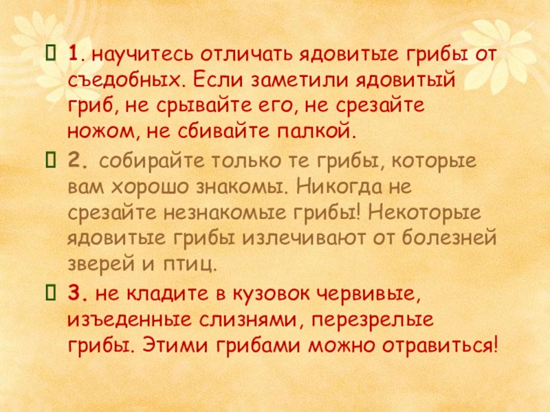 1. научитесь отличать ядовитые грибы от съедобных. Если заметили ядовитый гриб,