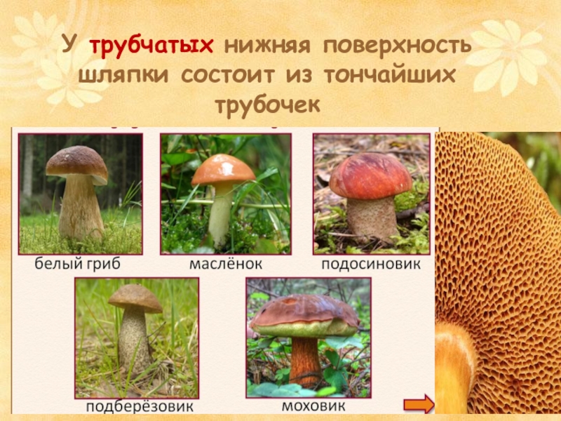 Слайд 4У трубчатых нижняя поверхность шляпки состоит из тончайших трубочек