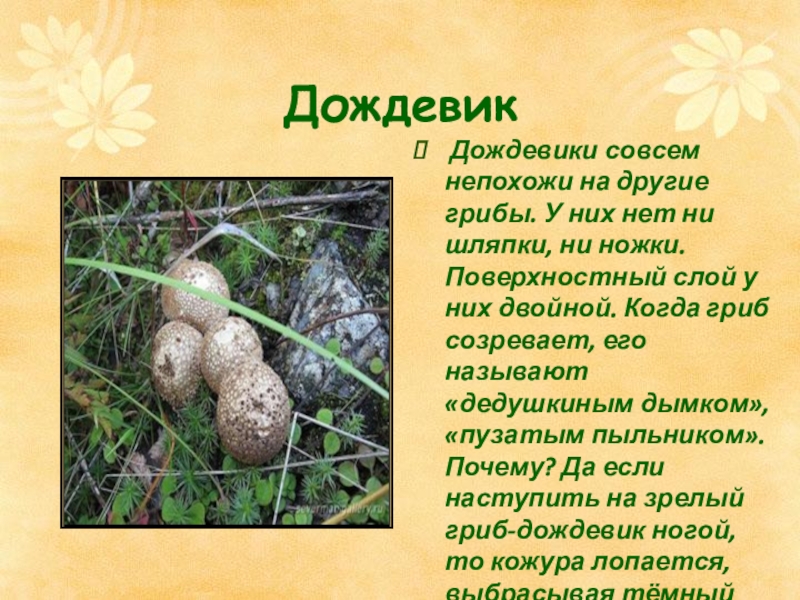 шляпки, ни ножки. Поверхностный слой у них двойной. Когда гриб созревает, его называют «дедушкиным дымком», «пузатым пыльником». Почему? Да если наступить на зрелый гриб-дождевик ногой, то кожура лопается, выбрасывая тёмный дымок
