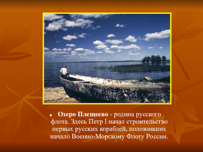 Слайд 10Озеро Плещеево - родина русского флота. Здесь Петр I начал строительство первых