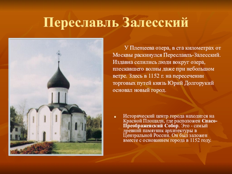 У Плещеева озера, в ста километрах от Москвы раскинулся Переславль-Залесский. Издавна селились люди вокруг озера, плескавшего волны даже при небольшом ветре. Здесь в 1152 г. на пересечении торговых путей князь Юрий Долгорукий основал новый город.