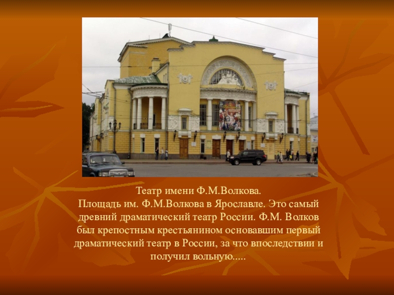 драматический театр России. Ф.М. Волков был крепостным крестьянином основавшим первый драматический театр в России, за что впоследствии и получил вольную.....