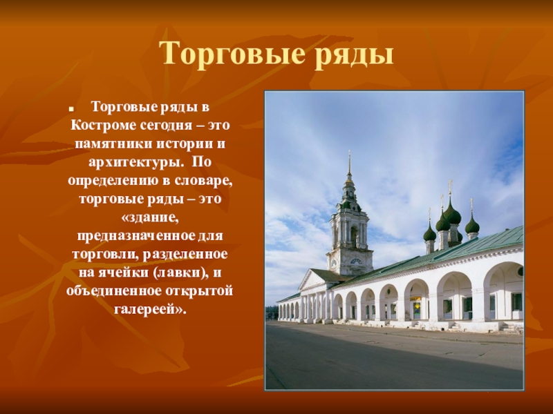 архитектуры. По определению в словаре, торговые ряды – это «здание, предназначенное для торговли, разделенное на ячейки (лавки), и объединенное открытой галереей».