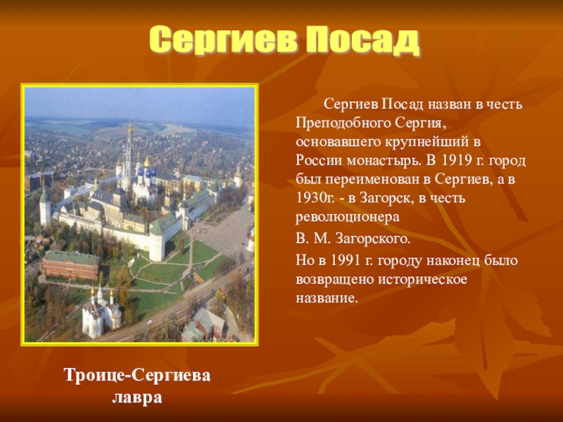 крупнейший в России монастырь. В 1919 г. город был переименован в Сергиев, а в 1930г. - в Загорск, в честь революционера