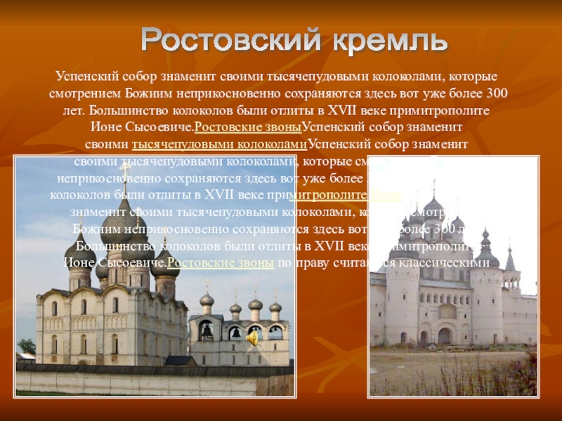 сохраняются здесь вот уже более 300 лет. Большинство колоколов были отлиты в XVII веке примитрополите Ионе Сысоевиче.Ростовские звоныУспенский собор знаменит своими тысячепудовыми колоколамиУспенский собор знаменит своими тысячепудовыми колоколами, которые смотрением Божиим неприкосновенно сохраняются здесь вот уже более 300 лет. Большинство колоколов были отлиты в XVII веке примитрополите ИонеУспенский собор знаменит своими тысячепудовыми колоколами, которые смотрением Божиим неприкосновенно сохраняются здесь вот уже более 300 лет. Большинство колоколов были отлиты в XVII веке примитрополите Ионе Сысоевиче.Ростовские звоны по праву считаются классическими
