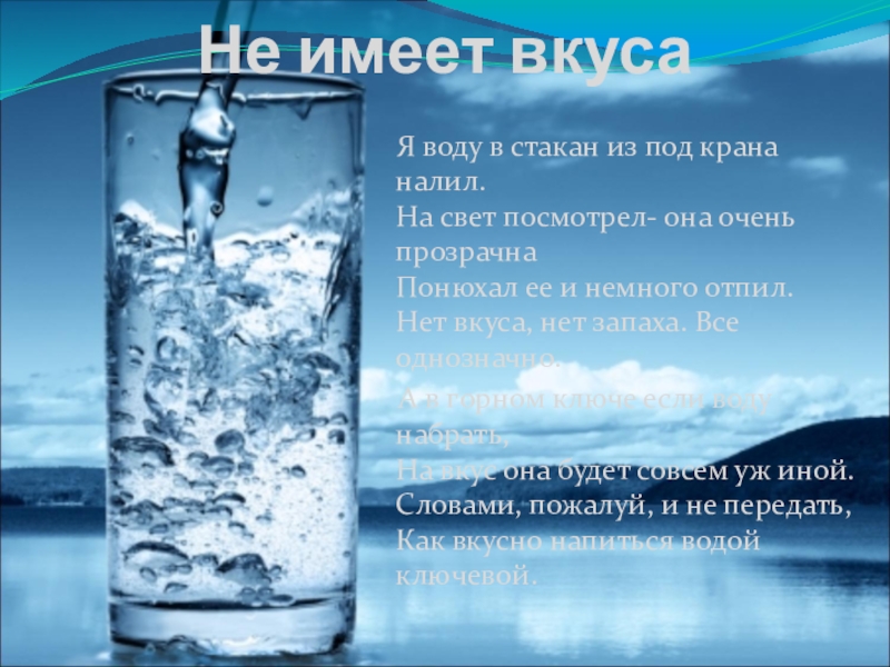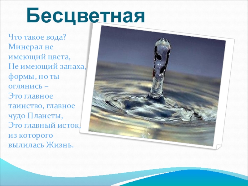 БесцветнаяЧто такое вода? Минерал не имеющий цвета, Не имеющий запаха, формы, но ты оглянись – Это главное