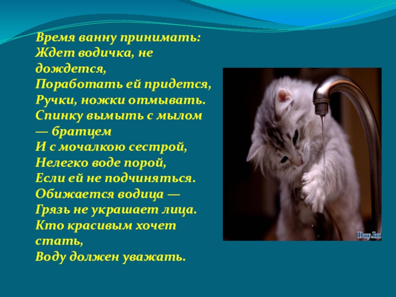 отмывать. Спинку вымыть с мылом — братцем И с мочалкою сестрой, Нелегко воде порой, Если ей не подчиняться. Обижается водица — Грязь не украшает лица. Кто красивым хочет стать, Воду должен уважать.
