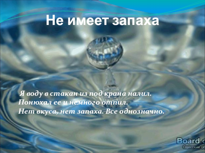 Не имеет запаха  Я воду в стакан из под крана налил. Понюхал ее и немного отпил.