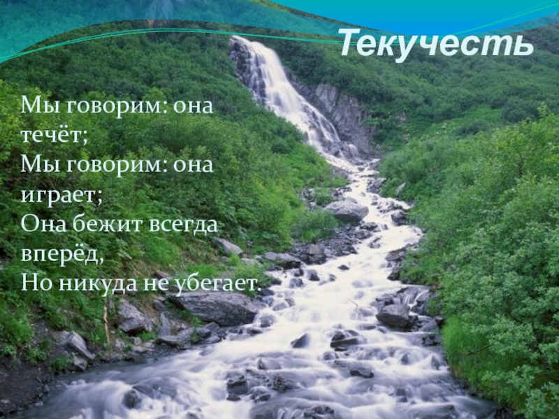 ТекучестьМы говорим: она течёт; Мы говорим: она играет; Она бежит всегда вперёд, Но никуда не убегает.